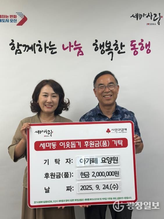 이번 기탁은 어려운 이웃들에게 작은 보탬이 되고자 하는 아가페 요양원의 따뜻한 뜻에서 마련됐으며, 전달된 성금은 세마동 행정복지센터를 통해 복지 사각지대에 놓인 주민들을 지원하는 데 사용될 예정이다.