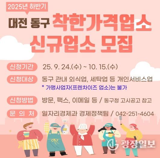 광장일보 이현나 기자 | 대전 동구는 지역 내 물가 안정과 건전한 소비문화 확산을 위해 2025년 하반기 ‘착한가격업소’ 일제 정비와 신규 업소 모집을 실시한다고 25일 밝혔다.