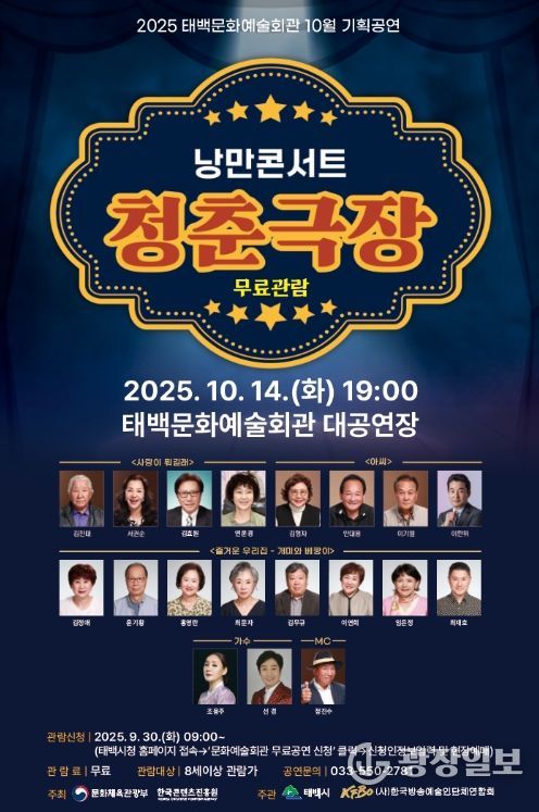 광장일보 이현나 기자 | 태백시는 오는 10월 14일 태백문화예술회관 기획공연 '2025 낭만콘서트 청춘극장'을 관객들에게 선보인다고 밝혔다.