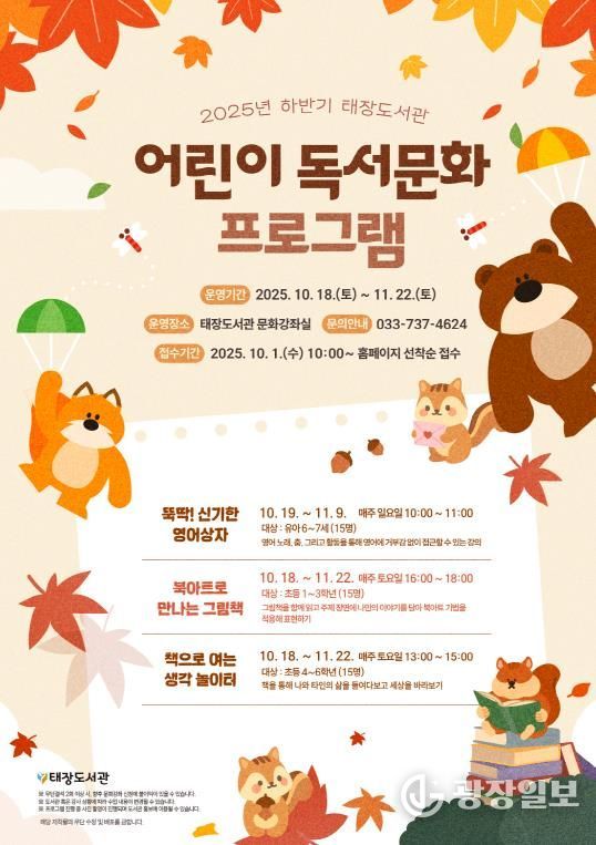 광장일보 이현나 기자 | 원주시 태장도서관은 관내 어린이들을 대상으로 2025년 하반기 어린이 독서문화 프로그램을 운영한다.