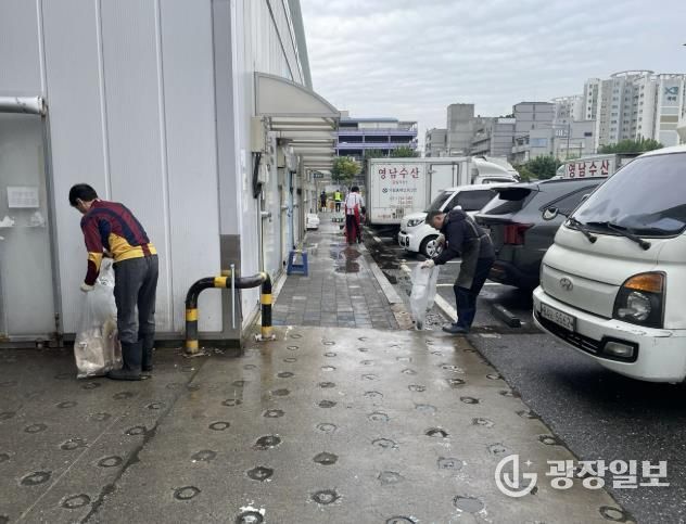 도매시장 보도와 차도, 지상·지하 주차장, 녹지공간, 흡연부스 등 이용객이 많이 찾는 구역을 청소했다. 법인·조합별로 책임 구역을 나눠 쓰레기를 수거했다.