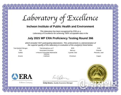 광장일보 주재영 기자 | 인천광역시 보건환경연구원은 미국 환경자원협회(ERA)가 주관한 2025년 환경분야 국제숙련도 평가에서 ‘최우수 등급(Laboratory of Excellence)’을 받았다고 밝혔다.