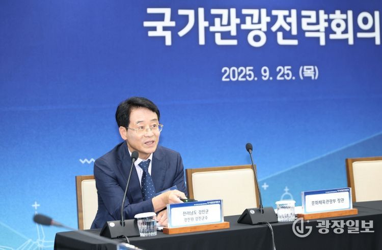 광장일보 주재영 기자 | 강진원 강진군수가 25일 서울 하이커그라운드에서 열린 제10차 국가관광전략회의에서 직접 전국 최초의 ‘반값여행’ 정책 성과를 발표했다. 이번 회의는 김민석 국무총리 주재로, ‘입국 3천만 시대를 여는 지역관광 확산 전략’을 안건으로 정부 부처와 한국관광공사, 관광업계 주요 인사들이 참석한 가운데 열렸다.