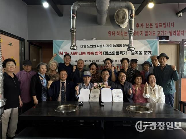 광장일보 이현나 기자 | 대한노인회 시흥시지회 능곡동분회와 황소화로육가 능곡직영점이 지난 9월 25일 능곡동 경로당 이용 어르신들의 복지 증진과 건강한 지역사회 조성을 위한 상호 협력 협약을 체결했다. 이날 협약식에는 김연규 대한노인회 시흥시지회장 등 30여 명이 참석했다.