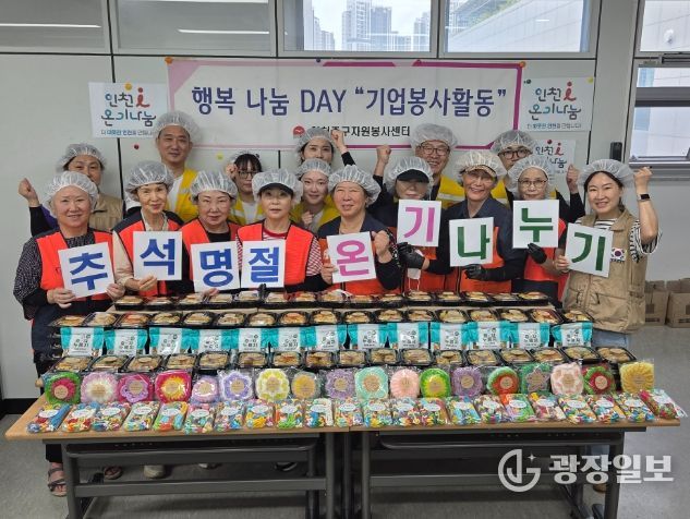 광장일보 주재영 기자 | 인천중구자원봉사센터는 민족 최대 명절인 추석을 맞아 지난 24일 인천공항에너지㈜(대표이사 이경용) 임직원과 함께 ‘온기 나눔 캠페인’과 연계한 ‘추석 명절 음식 나눔 행사’를 진행했다고 밝혔다.