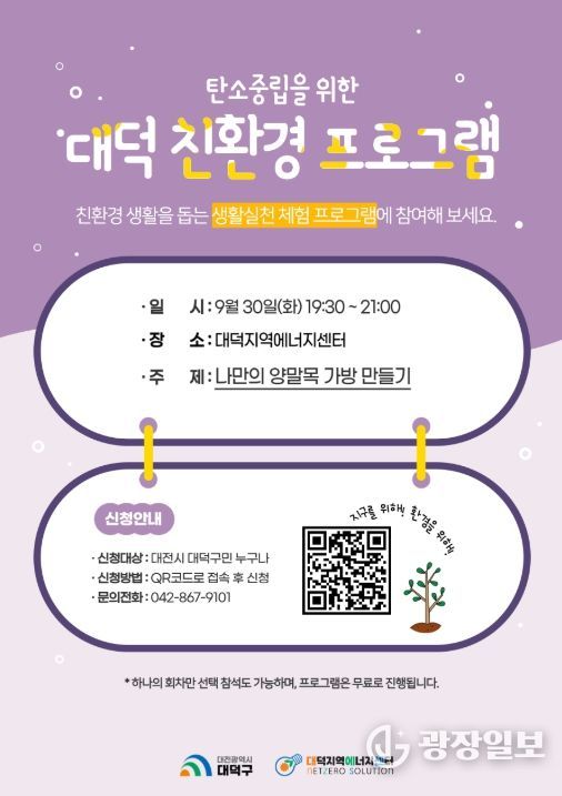 대덕지역에너지센터에서 진행되는 이번 프로그램은 재활용·탄소중립·녹색 생활 등 생활 밀착형 주제로 남녀노소 누구나 부담 없이 환경 보호에 참여할 수 있도록 구성됐다.