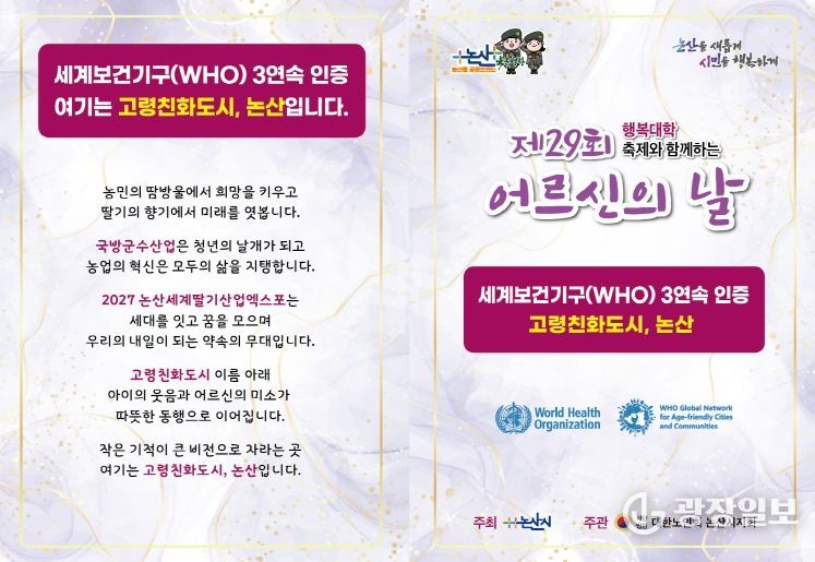 논산시 관계자는 “올해 어르신의 날 행사는 고령친화도시 재인증 선포와 함께 더 의미 있는 행사가 될 것”이라며 “많은 어르신이 안전하고 행복한 시간을 보내실 수 있도록 행사 준비에 만전을 기하겠다”고 말했다.