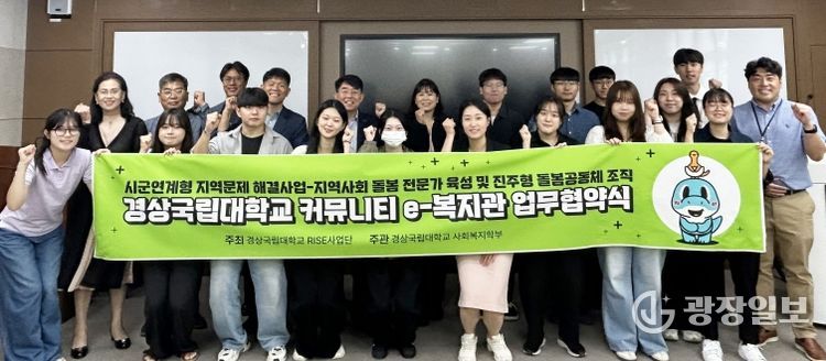 광장일보 주재영 기자 | 경상국립대학교라이즈(RISE)사업단 지역리빙랩(진주시) ‘경상국립대학교 커뮤니티 e-복지관’(대학 부설 가상복지관)은 9월 24일 오전 가좌캠퍼스 사회과학관 글로벌룸에서 진주시사회복지협의회, 경남서부권노인보호전문기관, 진주시평거종합사회복지관, 진주시가좌사회복지관, 경남서부권돌봄노동자지원센터와 업무협약을 체결했다.
