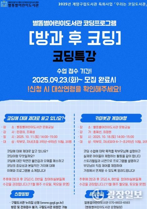 신청은 9월 23일부터 계양구립도서관 누리집을 통해 선착순 접수로 진행하며, 기타 자세한 사항은 별똥별어린이도서관으로 문의하면 된다.