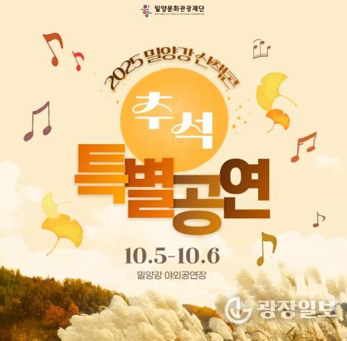광장일보 주재영 기자 | 밀양문화관광재단은 오는 10월 5일과 6일 양일간 삼문동 밀양강변 둔치 잔디밭(영남루 맞은편)에서 ‘2025 밀양강 산책콘 추석 특별공연’을 개최한다고 26일 밝혔다.
