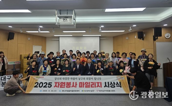 광장일보 주재영 기자 | 대구 남구는 대구 남구자원봉사센터(센터장 이창지)와 함께 지난 9월 24일, '2025 자원봉사 마일리지 시상식'을 열고 한 해와 오랜 세월 동안 지역사회를 위해 헌신해 온 우수 자원봉사자들에게 인증메달, 공로패, 핸드프린팅을 수여했다.