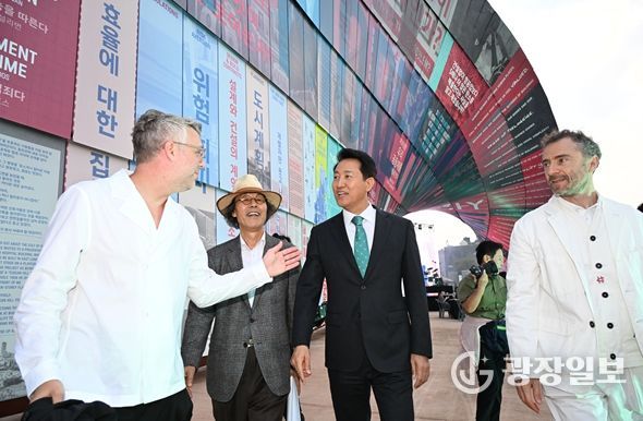 개막식에 앞서 오 시장은 토마스 헤더윅 총감독과 함께 서울도시건축전시관과 광화문광장을 차례로 방문해 전시 작품들을 둘러봤다. 이어 열린송현 녹지광장으로 이동해 철골과 스틸패널로 만든 대형조형물 ‘휴머나이즈 월(Humanise Wall)’과 ‘일상의 벽(Walls of Public Life)’을 차례로 관람했다.