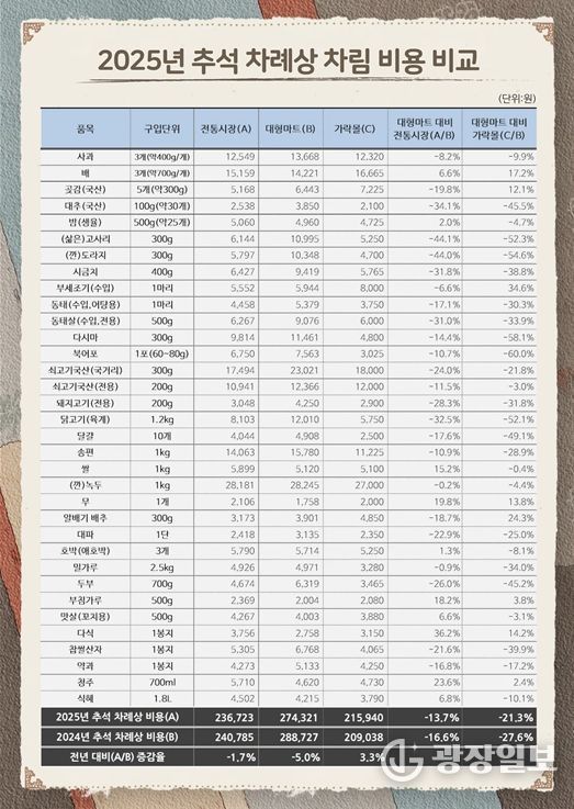 광장일보 주리아 기자 | 서울시농수산식품공사는 추석 명절 장보기에 도움이 되는 정보를 시민에게 제공하고자 서울시 내 대형마트, 전통시장, 가락시장(가락몰) 총 25곳을 대상으로 진행한 ‘추석 차례상 차림 비용’ 조사 결과를 발표했다.