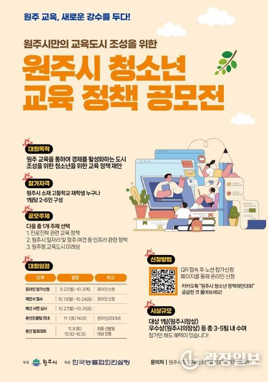 광장일보 이현나 기자 | 원주시는 지역 청소년들이 직접 제안한 정책을 바탕으로 교육도시 비전을 함께 만들기 위해 ‘원주시 청소년 교육 정책 공모전’을 추진한다.