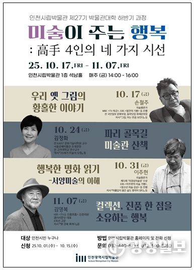 광장일보 주재영 기자 | 인천광역시 시립박물관은 ‘미술이 주는 행복: 高手 4인의 네 가지 시선’을 주제로 오는 10월 17일부터 11월 7일까지 매주 금요일 오후 2시에‘박물관대학’을 운영한다고 밝혔다.