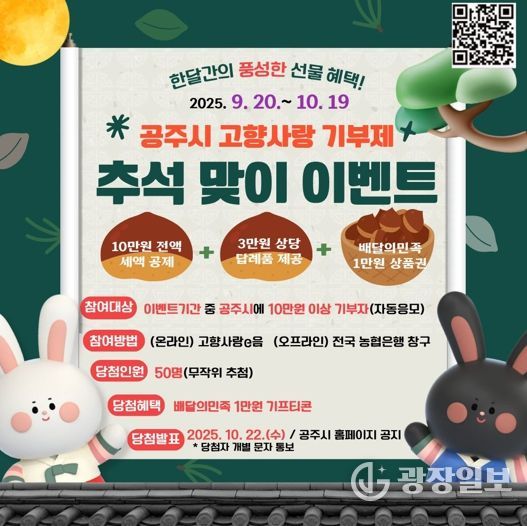 광장일보 주재영 기자 | 공주시는 추석을 앞두고 고향사랑기부 모금 활성화를 위해 ‘추석맞이 이벤트’를 진행한다고 29일 밝혔다.