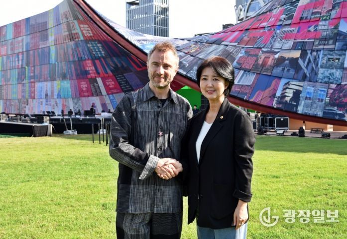 광장일보 주리아 기자 | 제5회 서울도시건축비엔날레 개최를 하루 앞둔 9월 25일 옥재은 서울시의원(중구2, 국민의힘)은 세계적인 건축가이며 총감독인 토마스 헤더윅과 함께 이번 비엔날레의 주요 행사장 중 하나인 송현광장(열린송현녹지광장)을 방문하여 현장 점검에 나섰다.