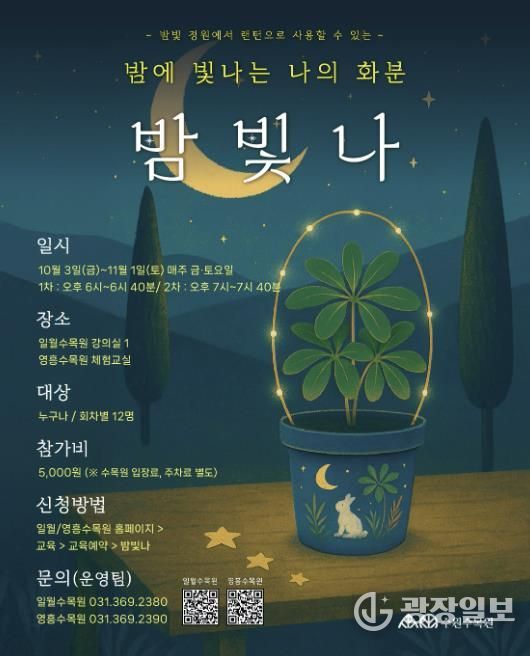광장일보 나학천 기자 | 수원특례시는 일월·영흥 수목원에서 10월 3일부터 11월 1일까지 매주 금·토요일 야간에 열리는 행사 ‘밤빛정원’에서 다양한 체험 프로그램들을 운영한다.