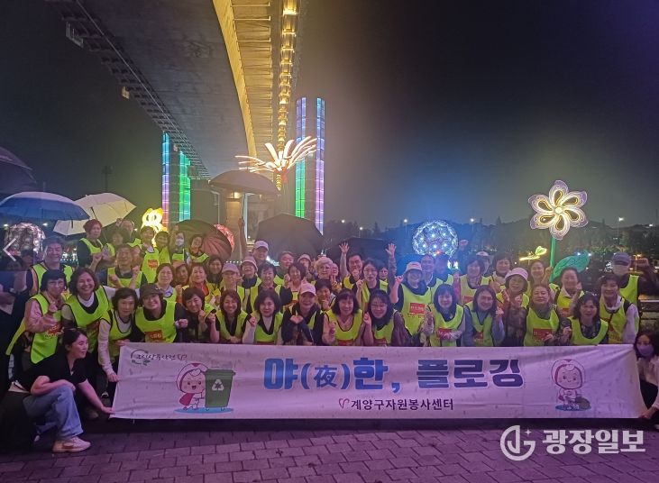 광장일보 주재영 기자 | 인천 계양구자원봉사센터는 지난 24일 저녁, ‘계양아라온 아트웨이(빛의 거리 3단계)’와 ‘가을꽃 국화축제’가 열리는 현장에서 자원봉사자 74명과 함께 ‘야(夜)한 플로깅’ 봉사활동을 진행했다.