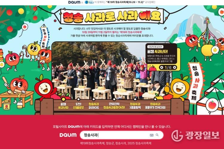 광장일보 주재영 기자 | 청송군은 29일부터 포털사이트 다음(daum)에서 11월 2일까지 '제19회 청송사과축제' 온라인 축제를 개최한다.