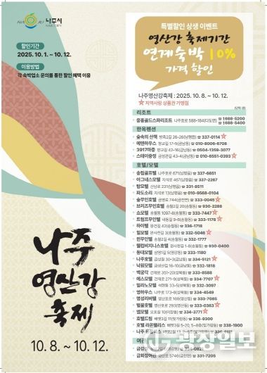 광장일보 주재영 기자 | 전라남도 나주시가 오는 10월 8일부터 12일까지 열리는 ‘2025 나주영산강축제’ 기간 동안 지역 숙박업소와 함께하는 숙박 특별할인 상생 이벤트를 마련했다.