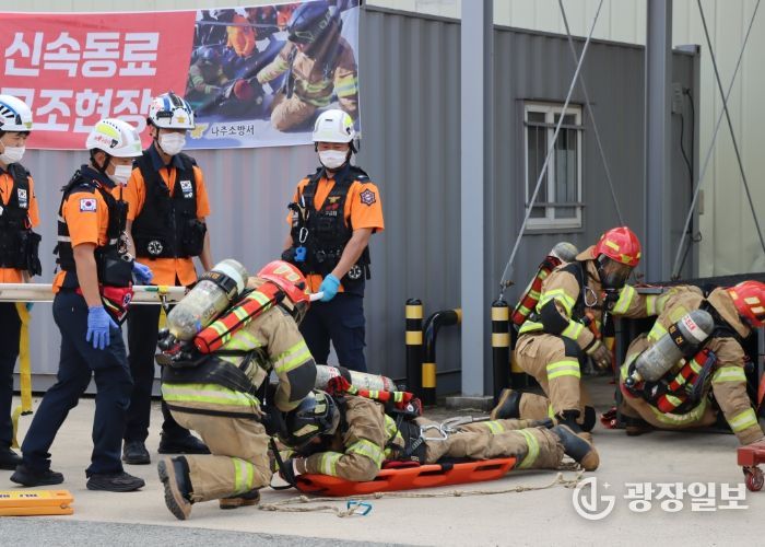 광장일보 주재영 기자 | 나주소방서는 29일 3M나주 공장에서 지자체, 경찰, 군부대, 관계기관 등이 참여한 가운데 긴급구조 종합훈련을 실시했다.