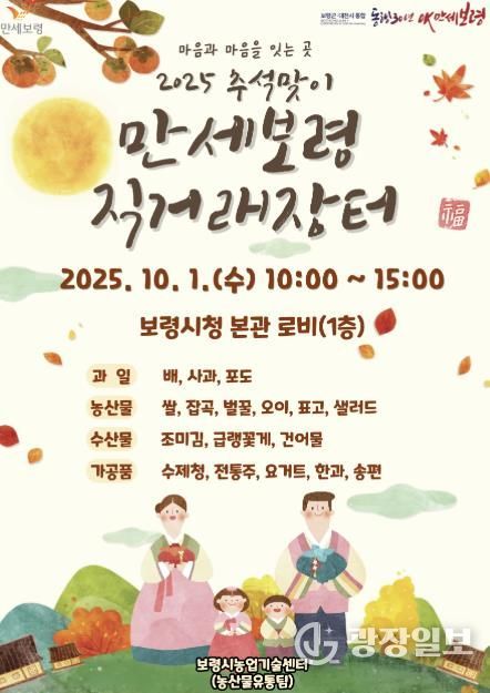 광장일보 주재영 기자 | 보령시는 추석을 맞아 10월 1일 보령시청 본관 1층 로비에서 ‘2025 추석맞이 만세보령 농특산물 직거래장터’를 운영한다고 밝혔다.