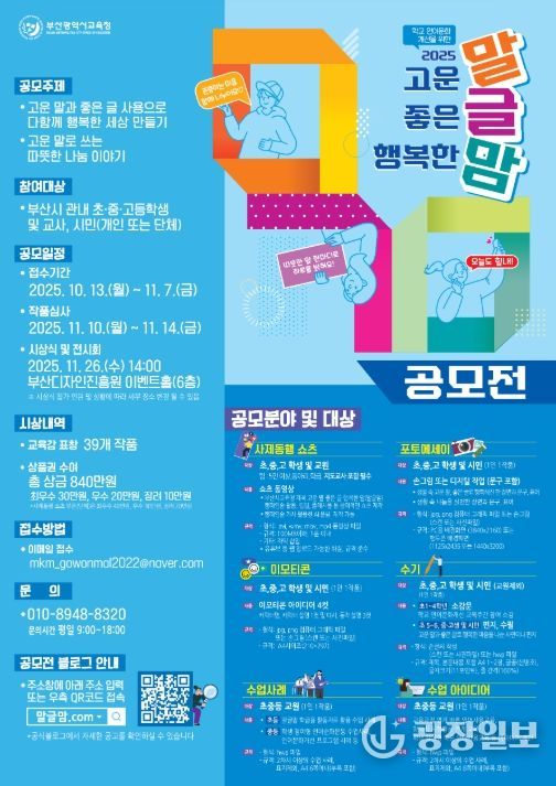 광장일보 주재영 기자 | 부산광역시교육청은 언어문화를 개선하고 배려와 존중의 문화를 확산시키기 위해 부산시 관내 초·중·고등학생 및 교사, 시민을 대상으로 고운 말 좋은 글 행복한 맘'말글맘'공모전을 개최한다.