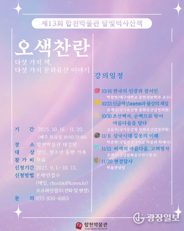 달빛역사산책은 2013년부터 이어져 온 합천박물관의 대표적인 야간 역사문화 강좌로, 지역민들에게 꾸준한 사랑을 받아온 프로그램이다. 올해는 ‘오색찬란 – 다섯 가지 색, 다섯 가지 문화유산 이야기’를 주제로 한국 문화유산 속 다섯 가지 색을 중심으로 역사․미술․고고학 분야 전문가들이 강연을 펼치며, 색을 매개로 문화유산의 의미를 새롭게 조명한다.