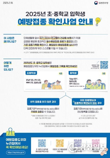 초등학교 입학생 필수 백신은 디프테리아·파상풍·백일해(DTaP), 폴리오(IPV), 홍역·유행성이하선염·풍진(MMR), 일본뇌염 등 4종이다.