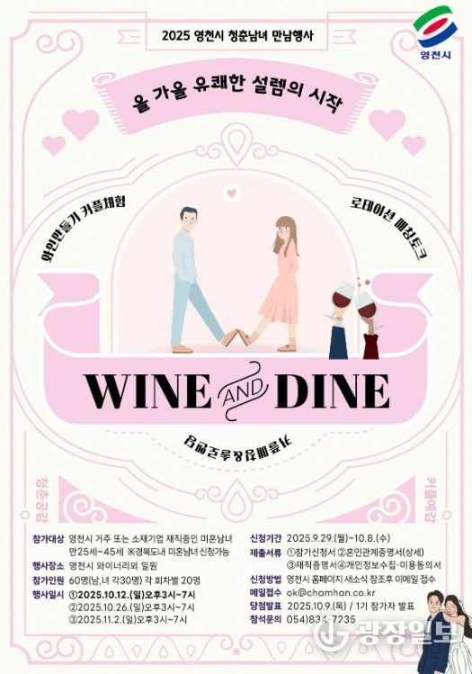 광장일보 주재영 기자 | 영천시는 오는 10월 12일, 10월 26일, 11월 2일 세 차례에 걸쳐 관내 와이너리에서 미혼남녀를 위한 특별한 만남 프로그램 ‘2025 영천愛 와인·다인(wine·dine)’을 개최한다.