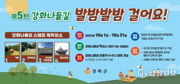 광장일보 주재영 기자 | 강화군은 10월 한 달간 강화나들길 활성화를 위해 ‘제5탄 강화나들길 발밤발밤 걸어요!’ 챌린지를 진행한다고 밝혔다.