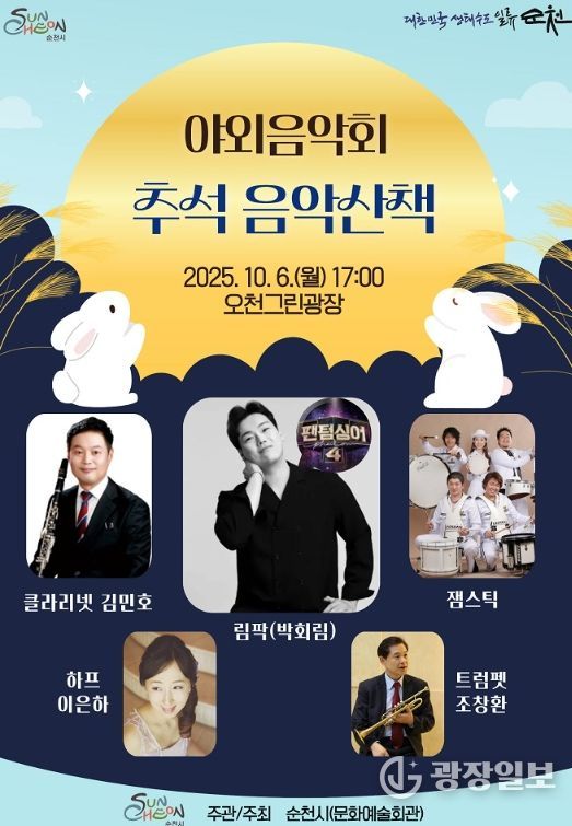 광장일보 주재영 기자 | 순천시 문화예술회관은 추석 명절을 맞아 시민과 관광객을 위한 야외음악회 '추석 음악산책'을 10월 6일 추석 당일 오후 5시에 오천그린광장에서 개최한다고 밝혔다.