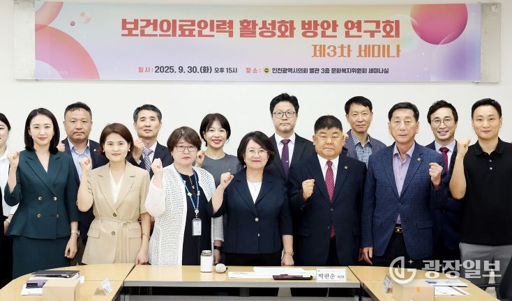 광장일보 주재영 기자 | 인천광역시의회 의원연구단체인 ‘보건의료인력 활성화 방안 연구회’는 30일 문화복지위원회 세미나실에서 박판순 대표의원(국·비례)을 비롯해 박창호(국·비례)·이봉락(국·미추홀구3) 의원, ‘의료기사단체 정책연구단’관계자 등이 참석한 가운데 ‘제3차 정책 세미나’를 개최했다.