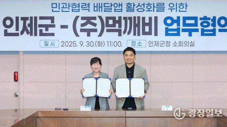 광장일보 이현나 기자 | 인제군은 9월 30일 군청 소회의실에서 민관협력 배달앱 ‘먹깨비’ 운영사와 업무 협약을 체결하고, 지역 소상공인 경영 안정과 군민 편익 증진을 위한 본격적인 협력에 나섰다.