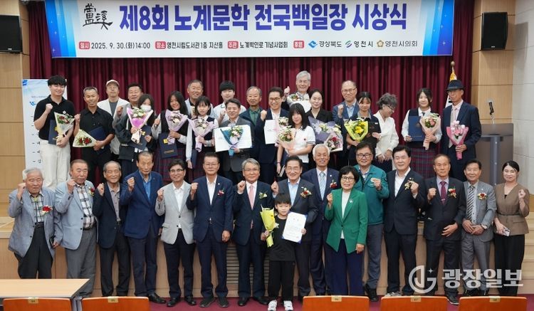 광장일보 주재영 기자 | 영천시는 노계박인로기념사업회가 주최·주관하고 영천시가 후원한 ‘2025년 제8회 노계문학전국백일장 시상식’이 30일 시립도서관 지산홀에서 성황리에 열렸다고 밝혔다.