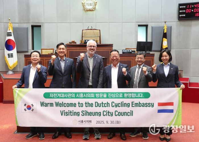 광장일보 이현나 기자 | 시흥시의회 도시환경위원회가 9월 30일 의회청사 소담뜰에서 네덜란드 자전거대사관(Dutch Cycling Embassy, DCE)을 초청해 간담회를 열고, 시흥시 자전거 정책 발전 방향과 친환경 교통 시스템 구축 방안에 대해 논의했다.