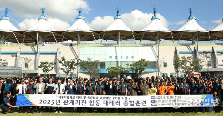광장일보 주재영 기자 | 전남경찰청은 나주종합스포츠파크에서 국가정보원(광주지부), 육군 제31보병사단, 제11공수특전여단, 공군 제1전투비행단, 전남소방본부, 영산강유역환경청 등 10개 기관 250여명이 참여한 가운데 관계기관 합동 대테러 종합훈련을 실시했다.