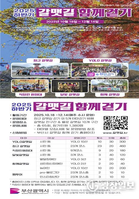 광장일보 주재영 기자 | 부산시는 오는 10월 18일부터 12월 14일까지 두 달여 간 '2025년 하반기 욜로(YOLO) 갈맷길 함께 걷기 행사'를 운영한다고 밝혔다.
