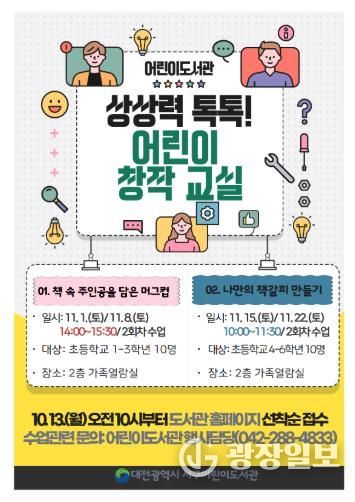 광장일보 이현나 기자 | 대전 서구 어린이도서관은 관내 초등학교 아동을 대상으로 ‘상상력 톡톡! 어린이 창작교실’을 운영한다고 1일 전했다.