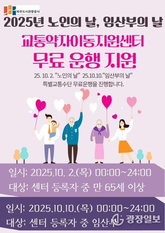 광장일보 주재영 기자 | 파주도시관광공사 교통약자이동지원센터는 10월 2일 “노인의 날”과 10월 10일 “임산부의 날”을 맞이하여 특별교통수단 무료 운행 서비스를 진행한다고 밝혔다.