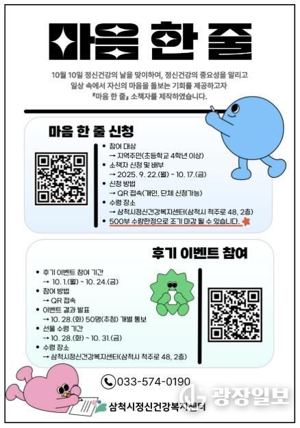 광장일보 이현나 기자 | 삼척시정신건강복지센터는 10월 10일 ‘정신건강의 날’을 기념하고 정신건강 주간(10월 10일 전후 1주간)을 맞아 지역 주민의 정신건강 인식 향상과 마음 돌봄의 중요성을 알리기 위해 ‘마음 한 줄’ 캠페인을 진행한다.