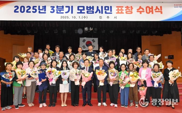 광장일보 주재영 기자 | 진주시는 1일 지역사회 발전과 봉사활동을 몸소 실천하며 귀감이 된 모범시민 81명을 대상으로 ‘2025년 3분기 모범시민 표창 수여식’을 개최했다.