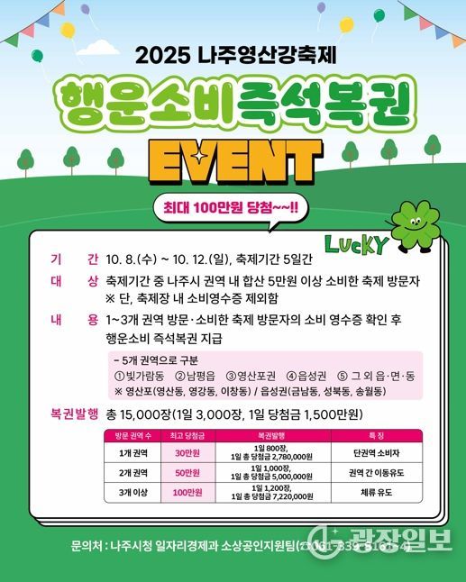 광장일보 주재영 기자 | 전라남도 나주시가 ‘2025 나주영산강축제’를 찾는 시민과 관광객들에게 특별한 즐거움과 함께 지역 상권 활력을 불어넣기 위해 ‘행운 소비 즉석 복권 이벤트’를 진행한다.