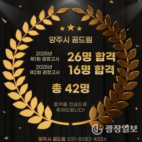 광장일보 주재영 기자 | 양주시 학교밖청소년지원센터 소속 청소년 42명이 지난 4월과 8월 실시된 2025년 초·중·고등학교 검정고시에 합격했다.