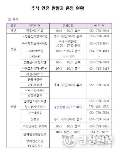 주요 관광지 휴무 및 운영 현황을 살펴보면 ▲국립울진해양과학관과 성류굴, 왕피천공원 내 시설물은 추석 당일인 10월 6일 휴관하며, ▲죽변해안스카이레일, 왕피천케이블카, 아쿠아리움은 연휴 기간 내내 정상 운영된다.