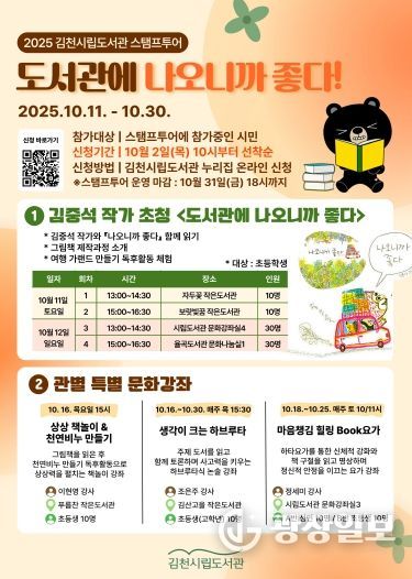 광장일보 주재영 기자 | 김천시립도서관(관장 이신기)은 오는 10월 11일부터 30일까지 도서관 스탬프투어 프로그램 '도서관에 나오니까 좋다'를 운영한다고 밝혔다.