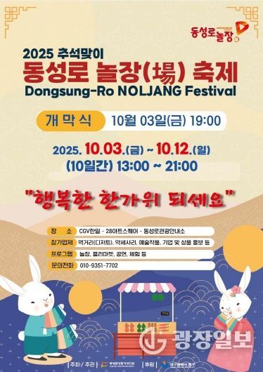 광장일보 주재영 기자 | 대구 중구는 10월 3일부터 12일까지 10일간 동성로 보행자전용도로 일원에서 ‘동성로에서 놀며 장보자!’라는 테마로 ‘2025 추석맞이 동성로 놀장(場) 축제’를 개최한다.