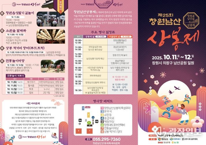 광장일보 주재영 기자 | 창원시를 대표하는 전통민속문화축제인 제25회 창원남산상봉제가 오는 11일부터 12일까지 이틀간 의창구 남산공원 일원에서 열린다.