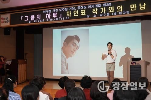 광장일보 주재영 기자 | 부산 남구는 지난 9월 30일 남구청 개청 50주년을 맞이해, 구청 1층 대강당에서 '제20기 등대빛 아카데미' 3강으로 배우 겸 작가 차인표 씨를 초청해 특별강연을 열었다.